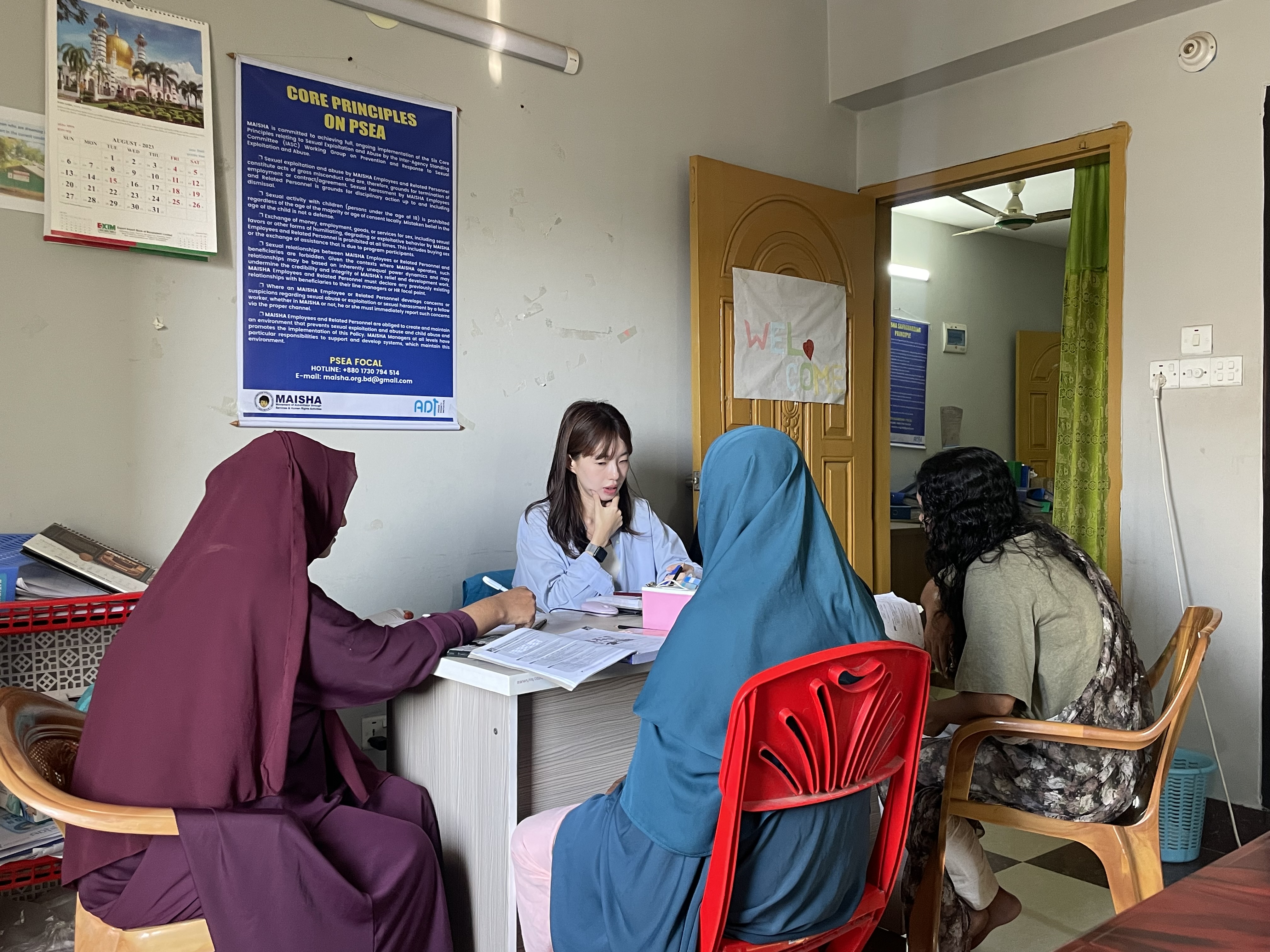 그렇지만 이제는 방글라데시 스태프의 업무 투여율을 줄이고 로힝야 여성들의 업무 투여율 높이는 때이기도 하거든요. 최근에는 그 과정에서 종종 한계를 느껴요. PSS분들은 센터 안에서 프로그램 제공하는 역할 외에도 각자 부여받은 역할이 있어요. 물건을 관리한다거나 청소를 한다거나 재고를 관리기도 하고, 또 등록부 관리도 직접 해요. 그런데 역시나 이 또한 시간이 많이 필요하겠다는 생각이에요. 생각해 보면 현지 직원(방글라데시 직원)이 100% 이해하고 실행해도 숙련되지 않으면 어려운 일인 건 맞잖아요. 답답할 때가 있지만, 실제로 방글라데시 직원들도 어려움을 겪고 있기 때문에, 사실 이렇게까지 완벽하지 않아도 지금 상태로도 나쁘지 않다고 생각해요. 언제나 그랬던 것처럼 천천히 가보려고 해요.