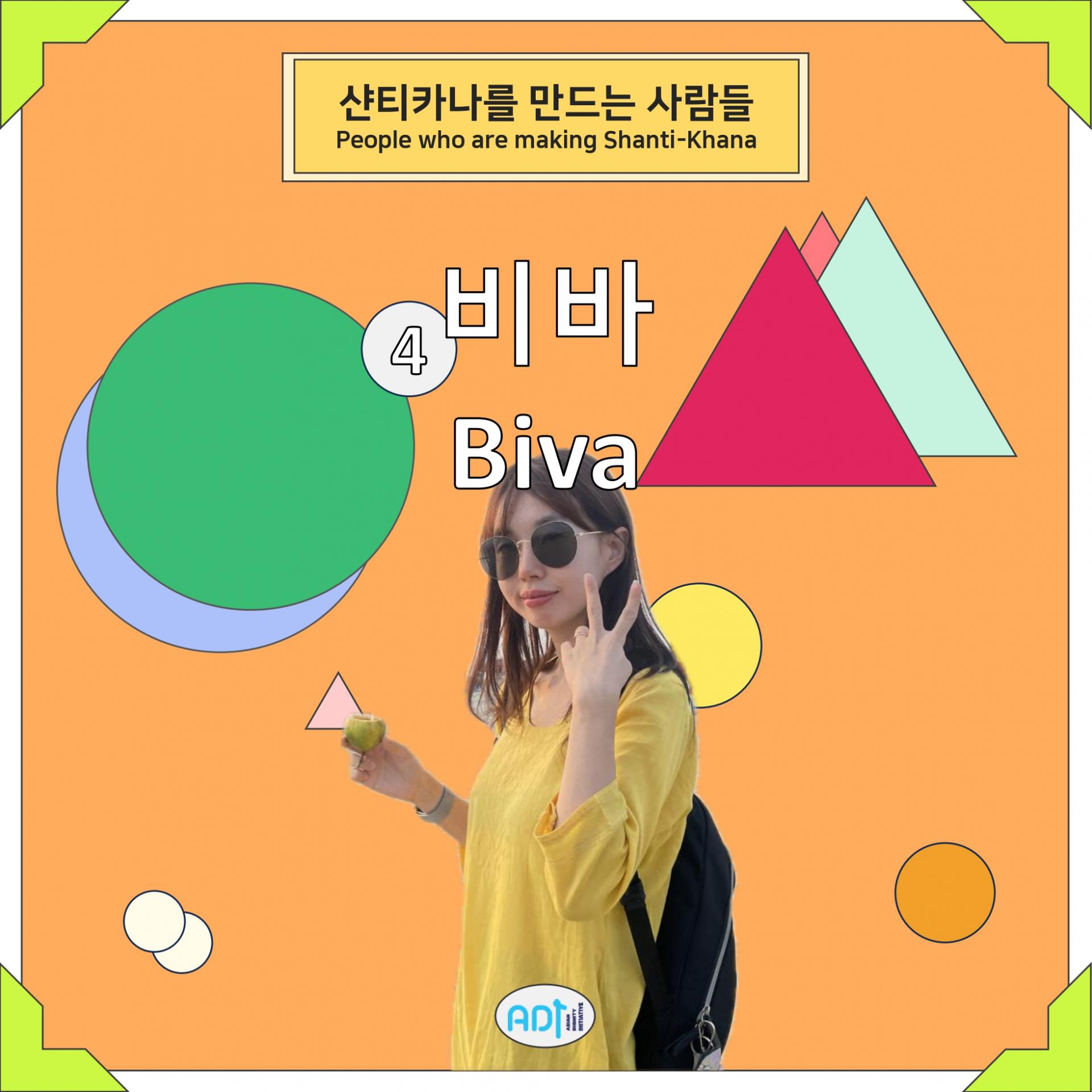○ 비바(Biva) 아디의 이승지 활동가로, 현재 인도적 지원팀에서 '로힝야 난민 및 수용공동체 여성 심리사회적 회복역량강화 사업' PM으로 함께하고 있다. 2022년 봄에 파견되어 현재까지 방글라데시 콕스바자르에서 체류하며, 방글라데시 현지 NGO인 RW Welfare Society와 함께 로힝야 난민캠프 '샨티카나'를 꾸리고 있다.