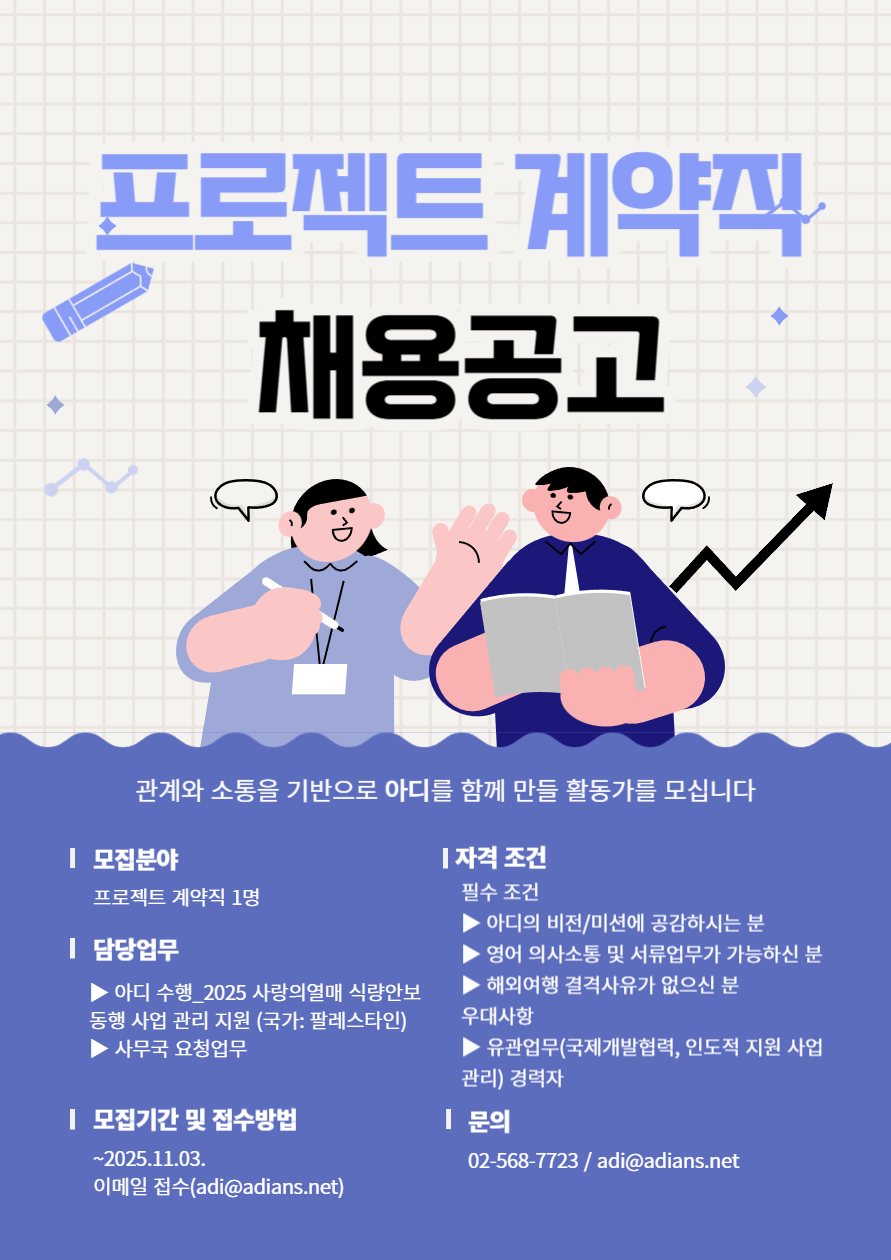 사단법인 아디에서 아래와 같이 아디 2025 사랑의열매 식량안보 사업 관리 지원 및 사무국 요청 업무를 담당할 활동가(프로젝트 계약직)를 채용 하오니 많은 관심 바랍니다.